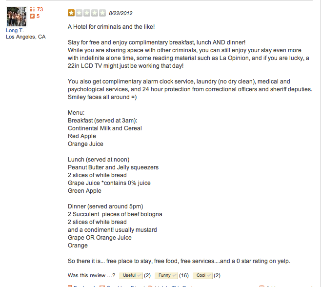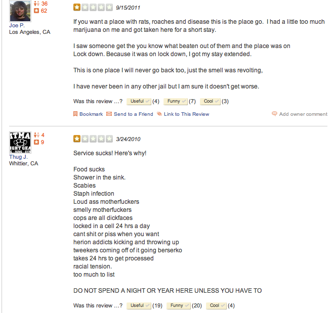 I was reminded of this today while doing some light Google research for a project on jails. As it turns out, there are a number of Yelp reviews for jails (google “jail site:yelp.com”). Unlike the detailed reviews one might find for a restaurant, many of the “reviews” I found initially were written by people who had not actually been incarcerated, and nearly all were “reviews” for jails in California (prisons on Yelp yield a more diverse geography). I wondered if this is because more people in California use Yelp, or if they feel such strong law and order sentiment that they feel the need to express it in all possible corners of the internet.