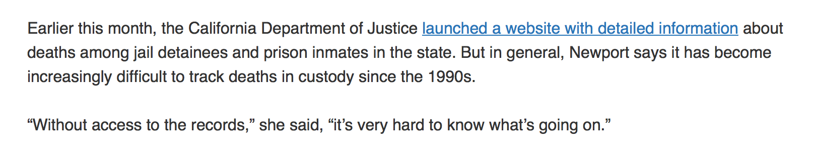 In the historical record it is difficult to find evidence of these deaths as they have not been consistently reported to newspapers and, as far as I can tell, there are no official documents that exist from my period of research (1950s-1990s) in which the jail even kept track of these incidents. For our own moment, transparency and accountability is key.