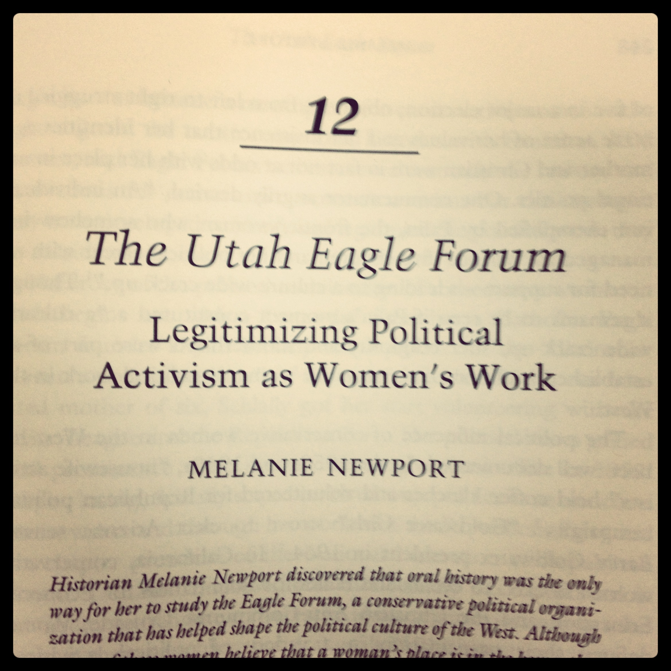 Five years after an oral history workshop at BYU, I received my copy of Oral History, Community, and Work in the American West in the mail. Knowing that the stories of the Utah Eagle Forum ladies will find a place on library shelves is surreal- the interviews I conducted in 2008 were some of the most interesting and honest expressions of belief and life experience that I have ever heard. It is strange that such deeply personal experiences may find an audience.